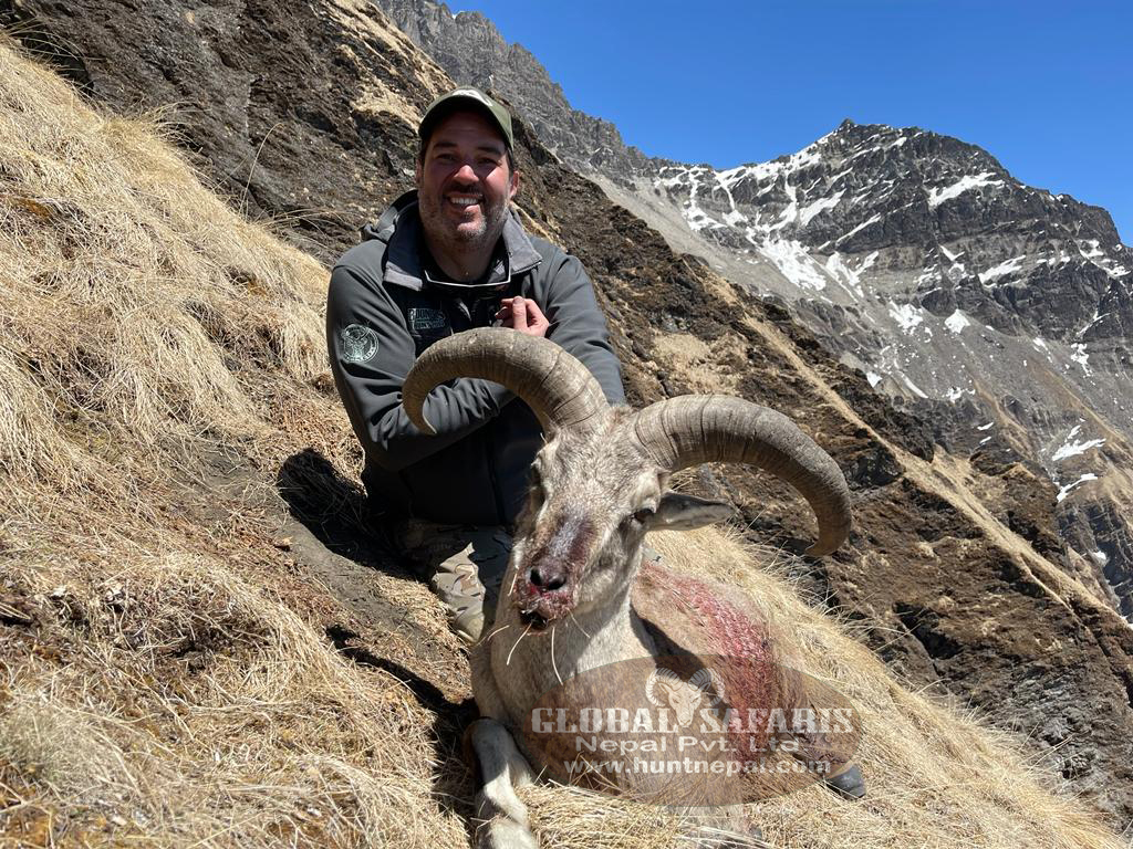 GSCO member Kevin Williams with his Himalayan Blue sheep from Nepal. These hunts are extremely physically demanding and are some of the highest hunts a mountain hunter will ever encounter.